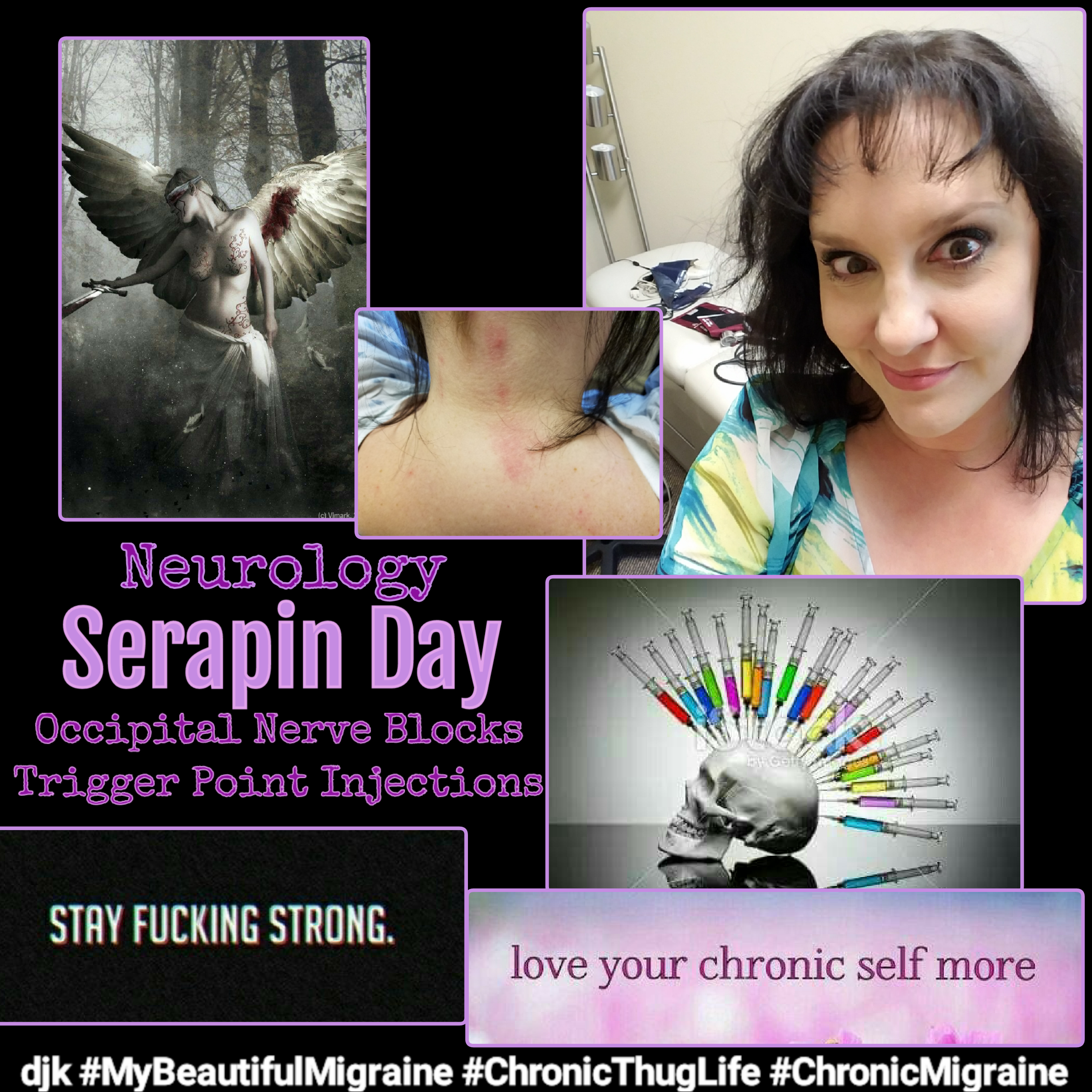 20 injections shoulders, neck, jaw, temples, sides and back of head from my Neuro NP Mariah. How migraineurs show love💉 Needles in the head.💜❤💜 Off to therapy. Share this: Click to share on X (Opens in new window) X Click to share on Facebook (Opens in new window) Facebook Like Loading... Related