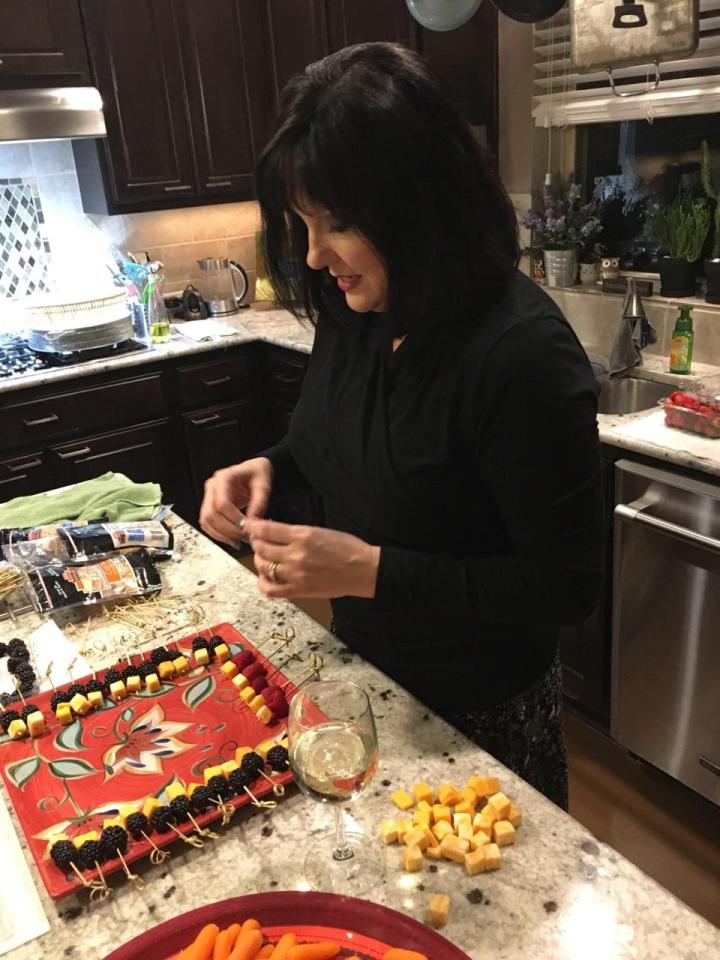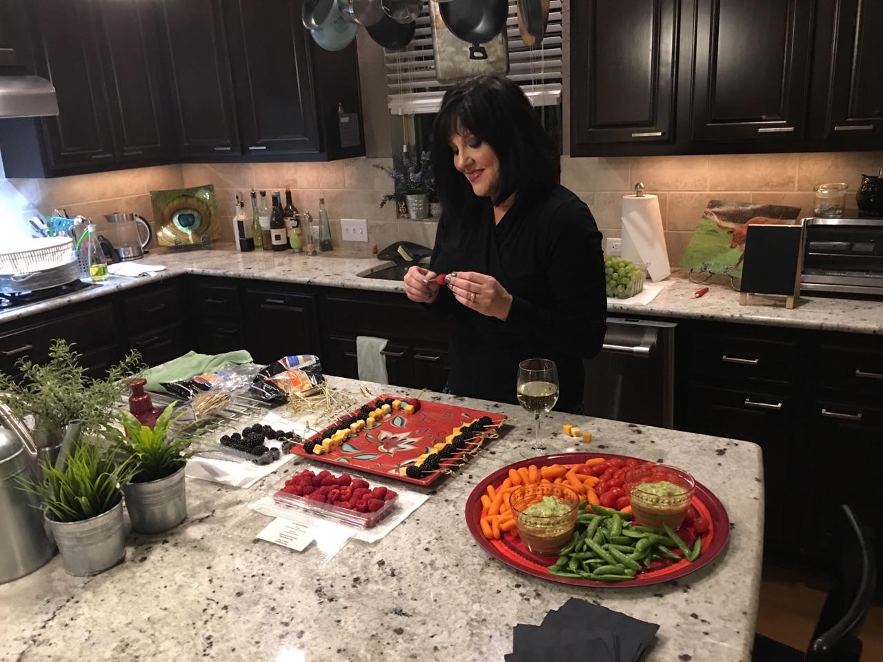 It’s 6:25 and the doorbell rings. Freaking neighbors Dawn and Tom are here as I’m still getting appetizers ready. “Wow, you’re early!” we say. “Oh good! We thought we were late.” (It’s obvious they don’t realize the party starts at 7). Marc gets them drinks and they offer to help me as I’m getting the apothecary jar prepped and appetizers skewered. I assure them I’ve got it. It’s awkward. But we just keep chatting. After I’m set at 6:56, I go to my bedroom to reapply lips and text Christy: “get here as soon as you can, the R*** showed up half hour early!” Lol. Christy is trying.