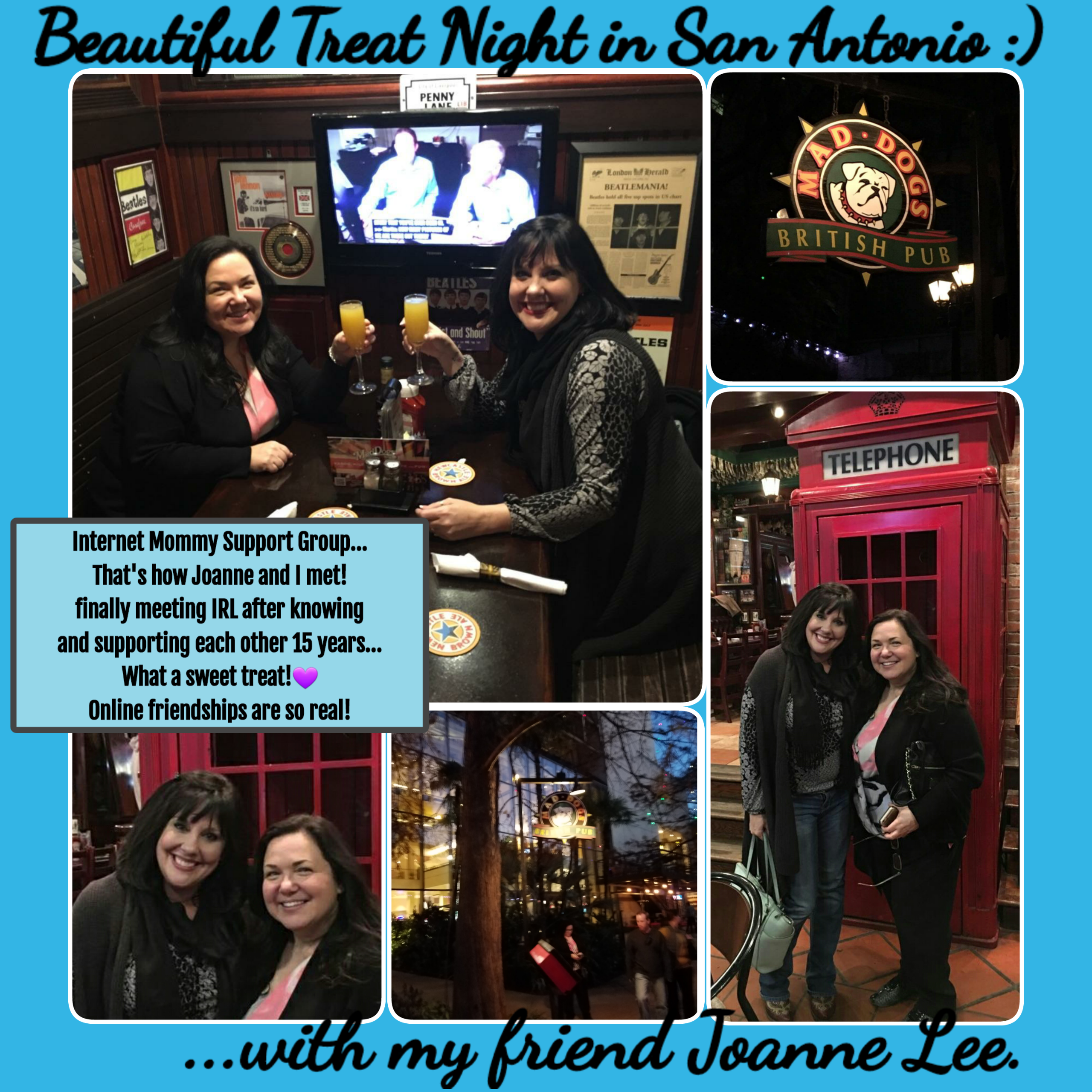 So grateful Marc could drive us down to meet up for dinner with Joanne Lee – one of my long-time internet mommy support buddies. She lives in Maine and was in San An for a photographer conference, winning awards. 😊