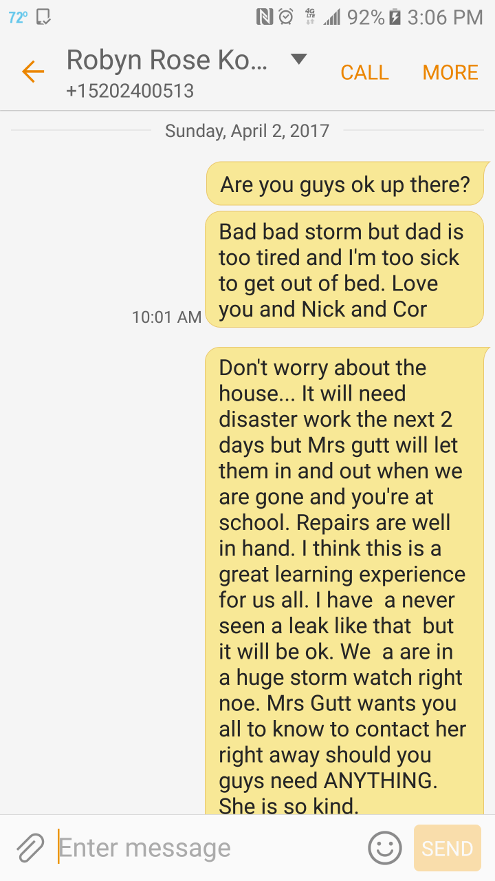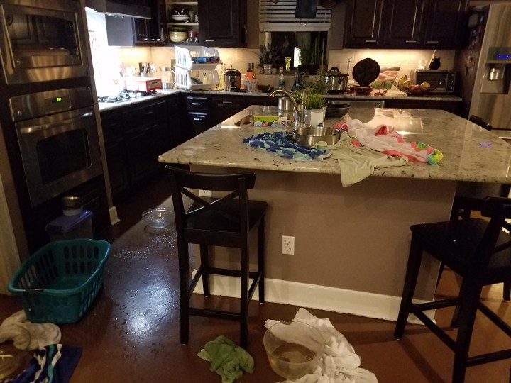 Robyn clogged her toilet last night.it was raining dirty water in the kitchen. Bucketfuls. Emergency leak company came at 1:30am. It will take three days to complete disaster project. Marc and I leave Tues.