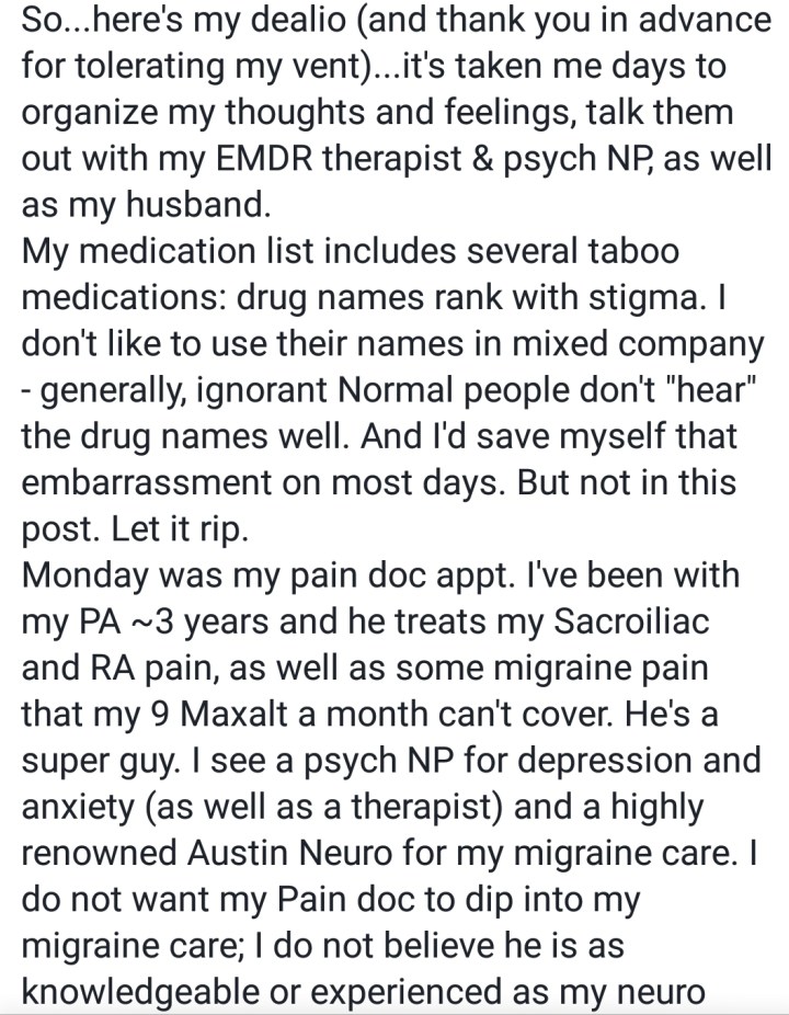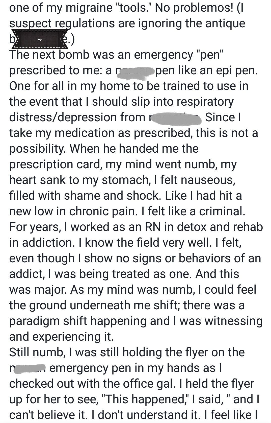 This is a story of an incident of a paradigm shift. This is a story of the shame I carry as a chronically ill person. I live in fear of judgment based on my experiences, both as a nurse and as a patient. This story is very important to me and it is 100% factual. But as I was about to publish, I found I couldn’t go through with it. Too much stigma associated with the labels, the words. And so I’ve retracted the names. I don’t know how I feel about my decision. So much shaming. So much stigma.