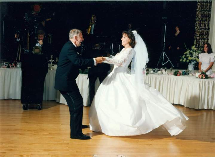 So… we were out ~ 1.5 hours. 🎊🎊 Party fast. When we got home, we watched our wedding video with our daughter. It was so fun and funny to see mega 1990’s styles! Oh those BIG glasses! Ha! Marc and I danced to the last song just like we were dancing on the video: