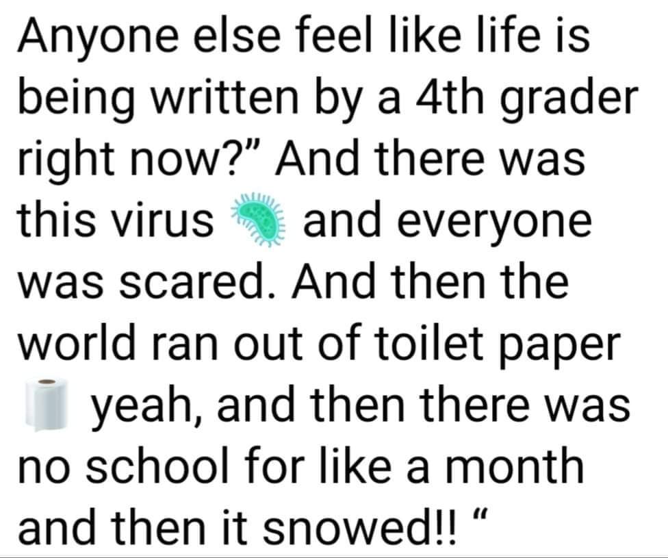• Watching the Normals have an apoplexy from quarantine is a little funny… watching the general public misuse medical equipment is amusing as well. There is great loss: both Robyn and Nick have lost their jobs (put on temporary leave). Schools have shit down: the kids will continue UT (Ken) online, TAMU (Corey) online, LTHS (Nick and Robyn) online. No word on prom or graduations.